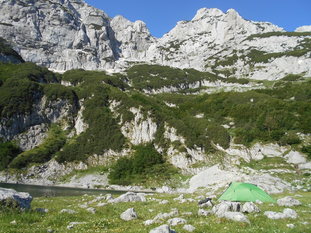 Coming down the other side of Bobotov Kuk we struggled to find a path over a saddle. Even when looking at the saddle we couldn’t see anything obvious, it just looked steep, loose and dangerous (my theory is the path may have been buried under as landslide). As such we ended up walking all the way down a valley and back up the other side, making for a very long day. As we approached a mountain hut with another designated camping area we were stopping by a ranger who prevented us from setting up a wild camp at a gorgeous nearby lake. Ironically when trying to communicate the price for camping in the designated camp he scratched the price into a rustic wooden picnic bench, surely doing more damage than we would have done camping?! The campsite we were sent to was next to another lake and wasn’t that bad but was very crowded – however a short walk around the lake to the side furthest from the hut gave us more privacy and solitude.