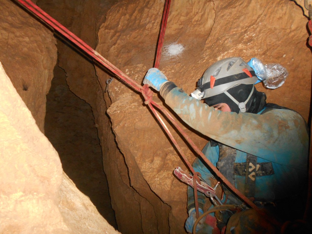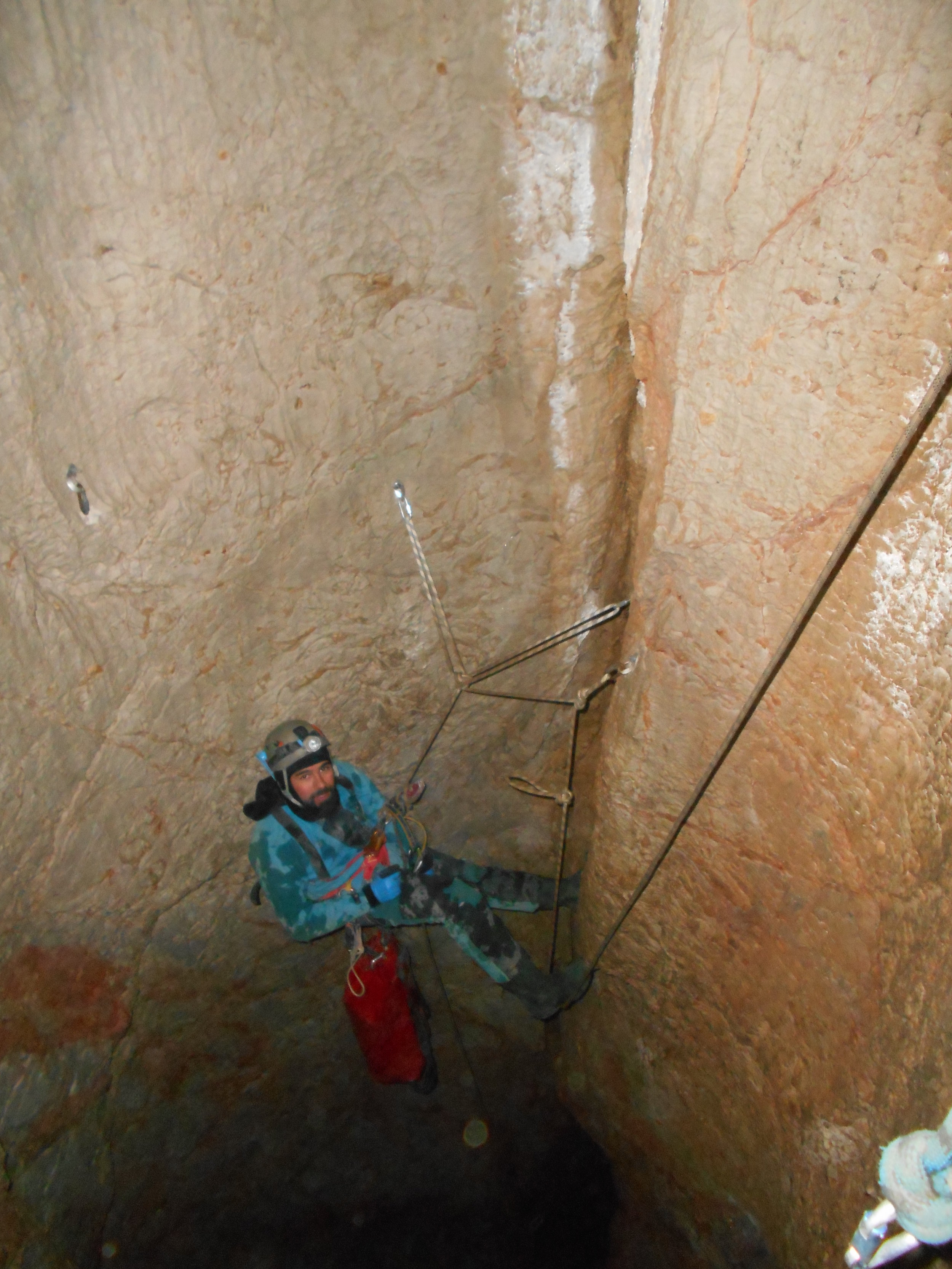 One thing I haven’t mentioned yet is that generally speaking my kit proved to be a bit rubbish on this trip. My oversuit had ripped. The contacts in my brand new caving lamp kept coming loose and my light would cut out sometimes and would be difficult to get going again. My pantin (foot jammer) kept jamming. My chest tape kept popping off. On one pitch when I was exiting from Forlorn Hope by myself my footloop (which had been tied years ago and which I’ve never had a problem with) somehow slipped, garrotting my foot like a noose and making it very difficult to prussik out (this led to me slowly making my way to the next bolt for safety and then performing some quite astounding aerial acrobatics to try and get myself free and my footloop retied). Anyway, all in all I wasn’t feeling too confident in myself or my kit. I descended the 30m to the end of the rope and it looked like the passage got a lot bigger and kept going. However this was one of the times my headtorch stopped working properly; I couldn’t see very far on my back-up and after untying from the rope and taking two steps away from it I got scared and decided to head back-up. To be honest neither Tom nor I covered ourselves in glory and tale of derring-do in this little exploration! Getting out was a lot harder but eventually I was up and through the rift. We headed back to camp and knew someone would have to come back to explore this further another time.