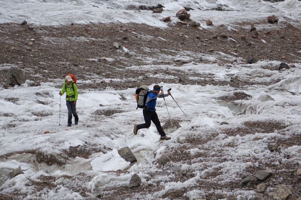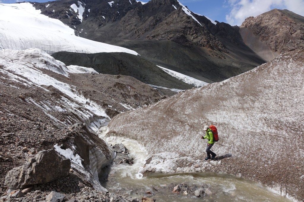 A second summit was conquered the very next day, with the three base camp convicts from the previous day wasting no time to taste the rarefied atmosphere of a first ascent. The long approach up a glacier ended in a spectacular ridgeline summit at 4418m, one side bordered not by a cliff but a clear overhang; not a place to hang around! This route also brought us the first tick on one of our scientific objectives for the expedition. A charity named Project Pressure work to document the world’s sadly vanishing glaciers, collaborating to inspire action on this global issue. As we would be venturing near glaciers that had rarely, if ever, been documented then we could add to their invaluable wealth of knowledge with geotagged photographs. This we did at several locations where we were climbing along with a couple of spots on our route out of the expedition.
