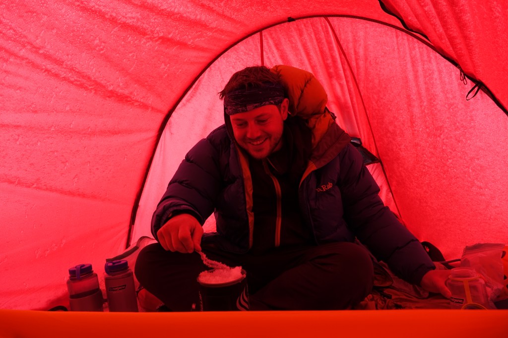 There is one trial that every mountaineer must pass when camping high. A tedious task that is absolutely necessary; melting ice and snow for drinking water. Not only does it take ages (needing to melt roughly 10 times as much snow for a given amount of water) but the end result is hardly aqua vitae. Still, needs must, especially when there’s tea to be brewed. With night quickly settling in and the temperature falling fast, there was little else to do but to nestle into our sleeping bags. The one issue was the thickly falling snow piling up our tent, threatening to collapse it. There was little option but to regularly shake the tent from the inside, hoping to dislodge the build-up of snow without causing the tent to fall in around us! I can’t pretend that it was the comfiest night’s sleep I’ve ever had. Two guys in a small tent in the cold results in a fair amount of condensation, which unfortunately results in a thick layer of hoar frost on the inside.