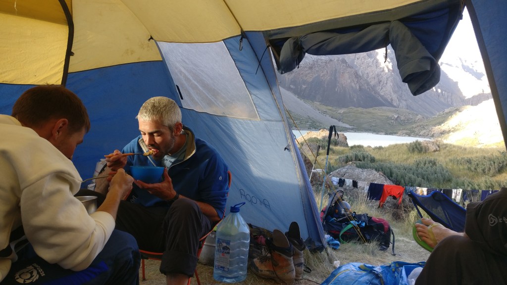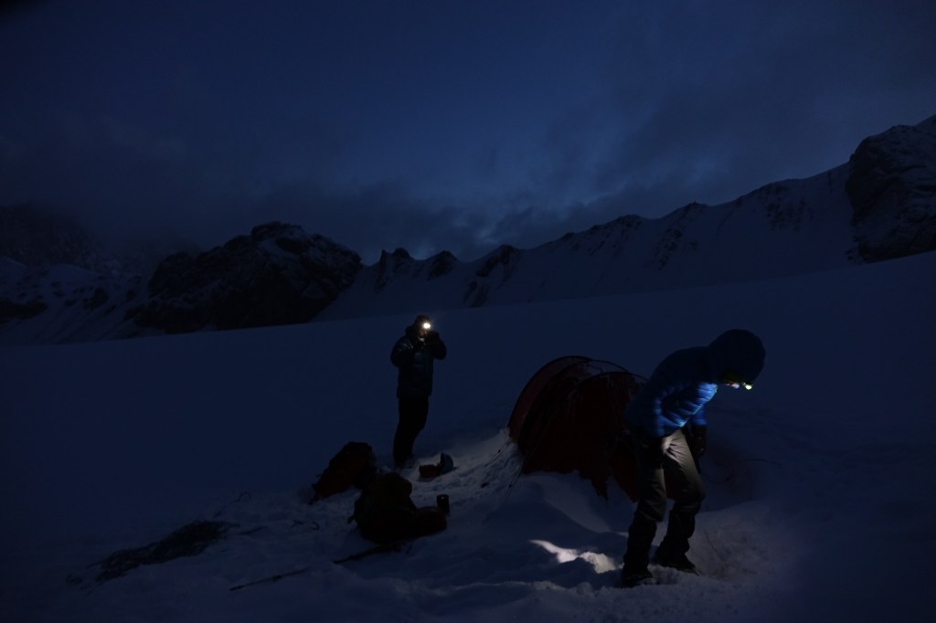 It would be another week before the final attempt for her summit. Hannah, Neil and Tom trail-blazed to find the route, setting the high camp on the glacier on the approaches at 4660m. Overnighting here they attempted an alpine start to summit in the morning. However, cumulative fatigue and insufficient calories exacerbated the altitude sickness of two of the party meaning a retreat was necessary. Brief respite at the high camp allowed for sufficient recovery to allow the three of them to reach base camp proper for a couple days of rest and just as importantly, food. It’s a minor miracle how much a simple but freshly cooked and warm meal can lift the spirits when you’re all but broken. Some camp cooked flat breads (which became a firm favourite) and weight off the feet allowed the three to make another attempt. They were joined by David and I, tagging along as a separate rope team to attempt the summit. We ascended to the high camp that still bore the evidence of the trio’s previous trip; the ledge dug out of the snow to accommodate the tent. Sadly, the ledge wasn’t big enough for the two tents (the lazy sods had only dug space for one on their previous trip, so inconsiderate) so some high-altitude digging was needed. The only tools for the job were ice axe adzes, making for a tiring dig at the end of a draining climb. Quick work was absolutely necessary though, as the daily afternoon blizzard soon hit, confining the parties to their tents.