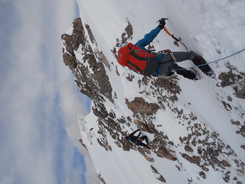 The slightest of movements resulted in indoor snow showers, the perfect wake up call for a summit day. But what a day. And what a morning. Brilliant sunshine poured over us from the moment the sun peeked over the horizon, warming our chilled bodies and energising us for the day. There is some difficult and dangerous terrain ahead, with crevasses and bergschrund to safely cross. We prepare our gear, roping up in two teams and head up the glacier, aiming for the summit ridge. Tom was ploughing through knee deep snow like a machine, making light work of what was clearly tough trail breaking. He soon reached the first major obstacle, a substantial bergschrund with only one route across; a thin snow bridge followed by a traverse over steep ground running out into a crevasse. Don’t look down! Thankfully the thick snow allowed for reassuring steps to be kicked into the slope over the steepest sections, with belays providing the reassurance when needed. Immediately we found ourselves at the most incredible saddle between two 5000m peaks. Incredible ridgelines added to the breath-taking vista, but we had little time to stand and stare. The summit ridge was ahead, taking us back to earlier. What had previously been thick snow became nothing but ice, with winds stripping away any powder lying on the ground. A few traverses required ice screw protection, but without too many incidents we suddenly found ourselves at a heavily corniced point where ground fell all around. The all-important GPS measurement was needed before we could be sure of our height. 5042m. The weather had held off and we were rewarded with views over miles and miles of pristine wilderness. We all sat on the summit and drank it in, recovering from our efforts and relishing the sheer joy of existing in such a fine place. The summit is not the reason that we mountaineer, it is never the sole aim and the imperative to put the human body into such places is not driven purely by a desire to stand on the top. However, there is no denying that such a moment can crystallise the payback for months of planning, effort and sacrifices. That moment we shared on the summit gave back in spades.