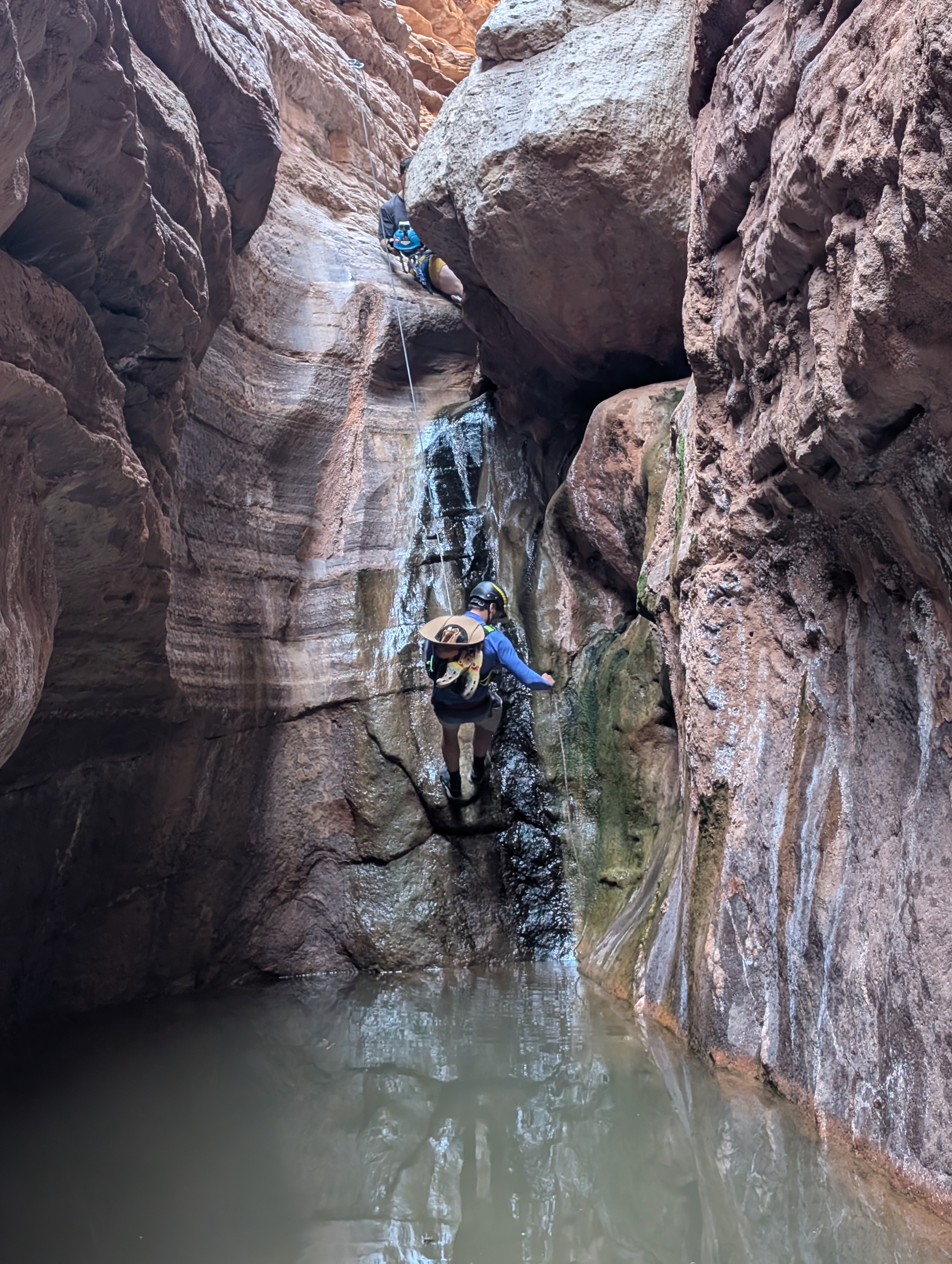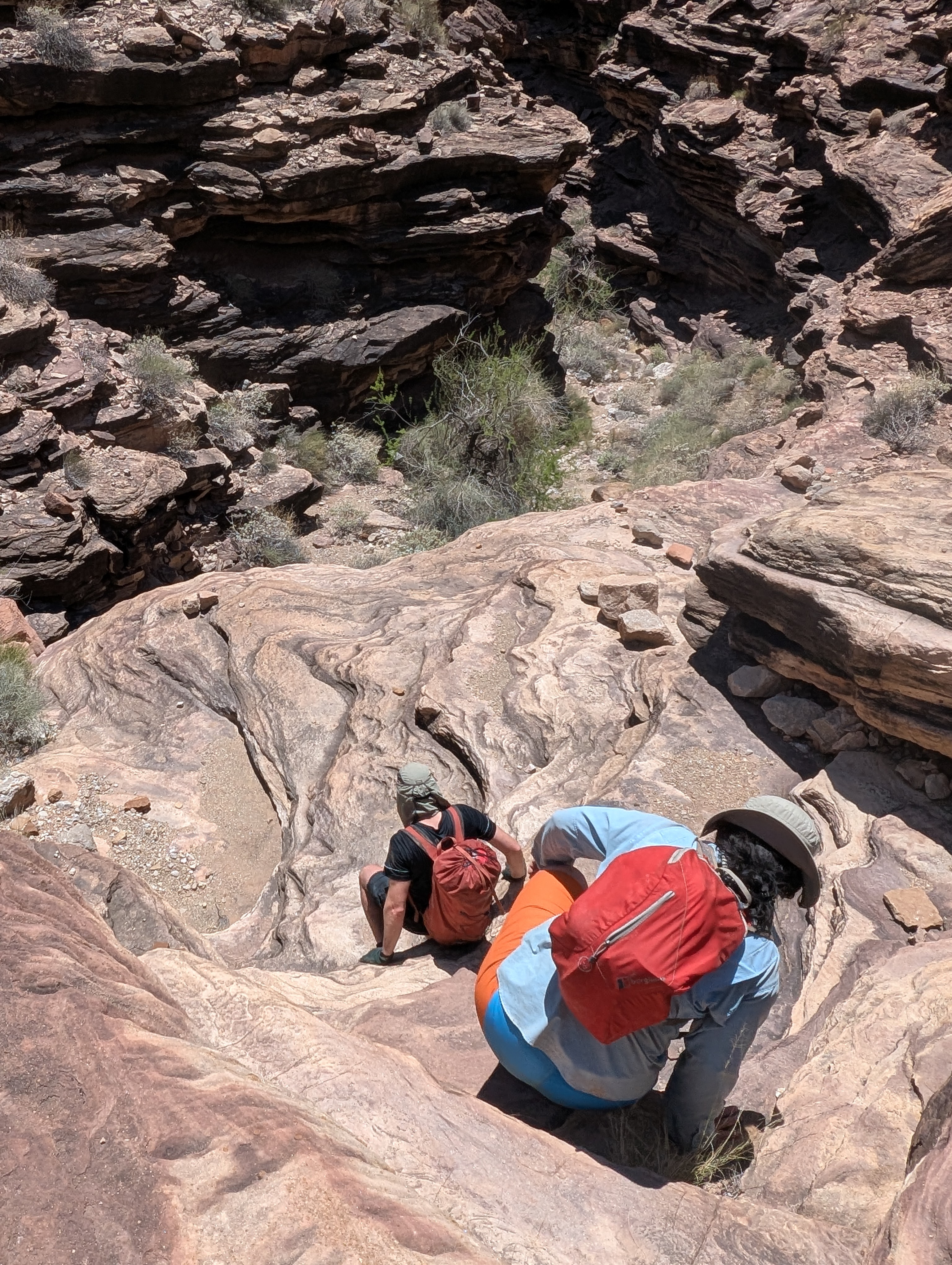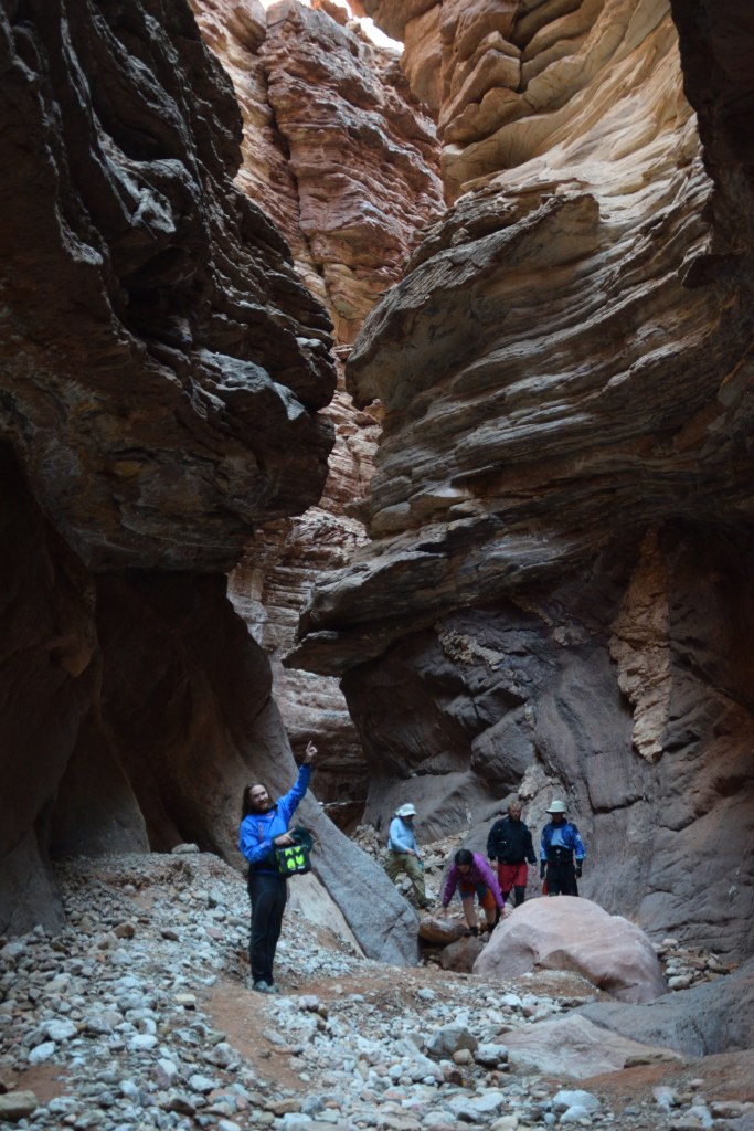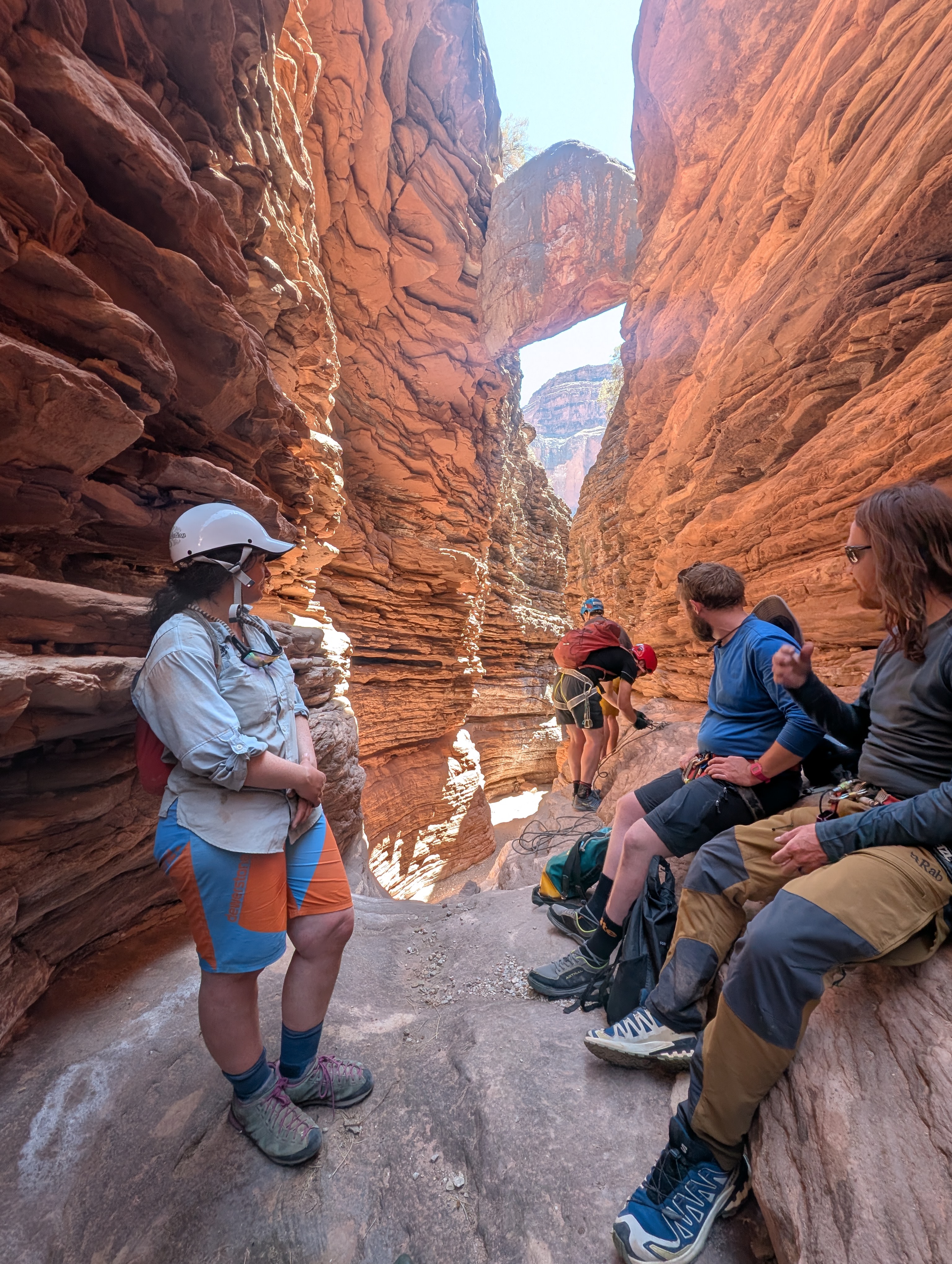 Exploring the side canyons was a highlight of the trip for me; and we tried a couple of pushy adventures with our ropes. I’ve spent time in deserts before but the canyon was something else – timing treks and managing water supplies to be able to get into the side canyons to descend them was a challenge (on one occasion we got caught out and retreated, but even at rest whilst sitting in the shade on the descent my pulse was about 50% higher than normal – my body effectively shutting down in the sun).
